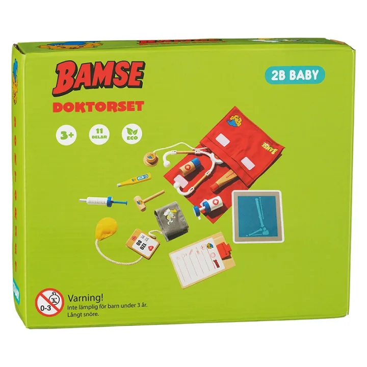 2B Baby Bamse Doktorset i Trä är en rolig doktorsväska med massor av tillbehör. Setet innehåller alla tillbehör som behövs för att kunna undersöka, st älla diagnos och ge behandling. Leksakssetet består av 11 delar inklusive tygväska med olika medicinska leksaksredskap. Från 3 år. Innehåll: stetoskop, termometer, reflexhammare, blodtrycksmätare, utdragbar spruta, pumpburk, pillerburk, salva, röntgenbild, rapportkort och förvaringsväska.