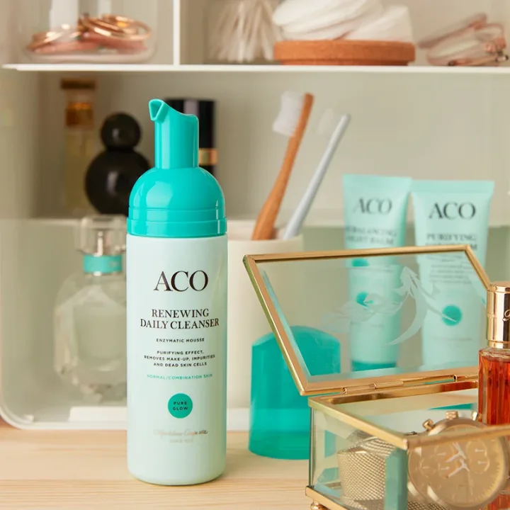 ACO Face Pure Glow Renewing Daily Cleanser är en enzymrengöring för ansiktet som avlägsnar både makeup och orenheter. En behaglig rengöringsmousse för ansiktet som innehåller salicylsyra (BHA) och exfolierande enzym. ACO Face Pure Glow Renewing Daily Cleanser passar även bra att använda som peeling 1-2 gånger per vecka. För att använda ACO Face Pure Glow Renewing Daily Cleanser som peeling appliceras produkten på fuktig hy och låt sedan verka i 1 minut. Skölj därefter ansiktet med ljummet vatten och klappa försiktigt huden torr med en mjuk handduk. Passar normal till kombinerad hy. 150 ml.