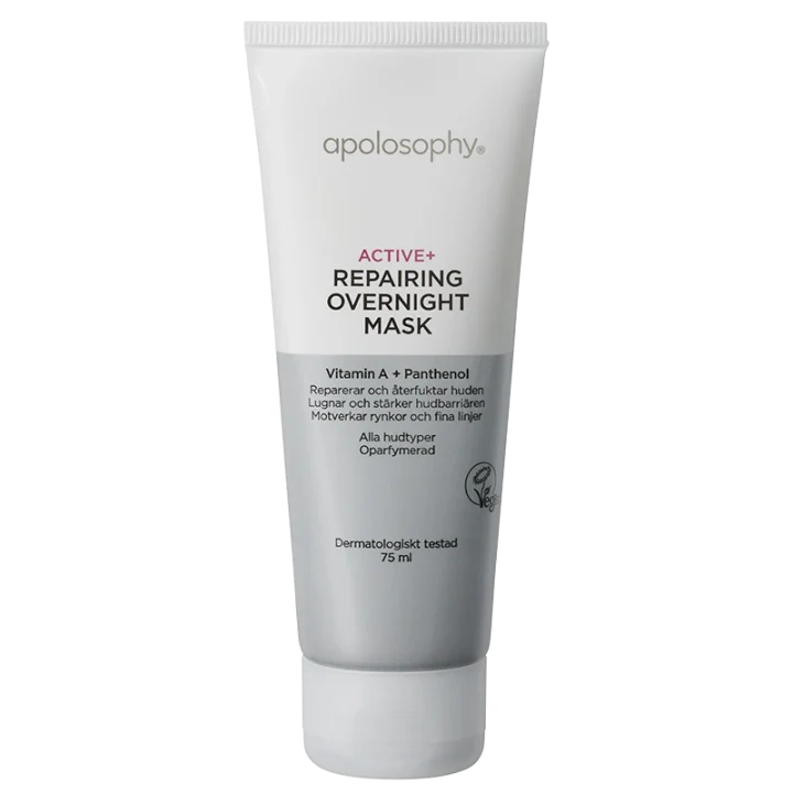 Apolosophy Active+ Repairing Overnight Mask är en fyllig, rik och reparerande ansiktsmask som används med fördel på natten och bidrar till en återfuktad och utvilad hud. Tack vare retinyl palmitate, en klassisk A-vitamin, stimuleras hudens förnyelseprocess och tillväxten av kollagen. Panthenol (provitamin B5), vitamin E och squalane mjukgör, lugnar och stärker hudbarriären. Rekommenderas ej för personer med känslig hud. 75 ml.