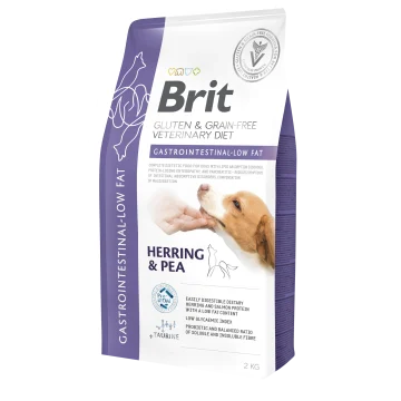 Brit Gluten & Grain-Free Veterinary Diet Dog Gastrointestinal Low fat är ett komplett dietfoder för hundar som lider av kroniska eller tillfälliga magproblem och tarmproblem. Fodret kan även passa hundar som till exempel har proteinförlorande eteropatier, pankreatit eller exokrin pankreasinsufficiens. Torrfodret reducerar intestinala absorptionsstörningar och kompenserar vid matsmältningsbesvär. Med gula ärtor och sill. 2 kg.