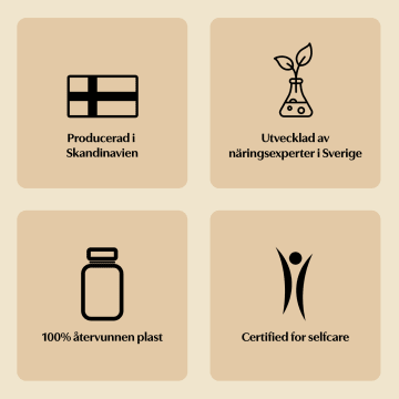 Rekommenderad dos bör inte överskridas. Bör inte användas som ett alternativ till en varierad och balanserad kost och en hälsosam livsstil. Förvaras torrt i rumstemperatur, ej i direkt solljus. Förvaras alltid utom räckhåll för små barn.