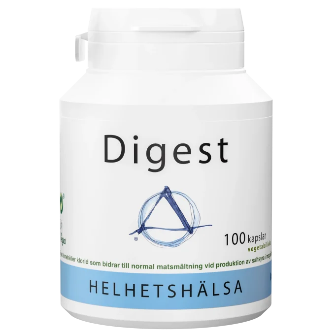 Helhetshälsa Digest är ett kosttillskott med klorid. Klorid bidrar till normal matsmältning vid produktion av saltsyra i magsäcken. Innehåller 216 mg klorid per kapsel. Kapslarna är vegetabiliska och veganska. 100 st.