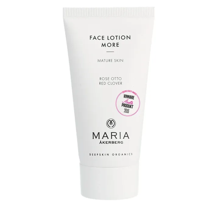 MARIA ÅKERBERG Face Lotion More är en fuktbevarande lotion som hjälper till att förbättra hudens elasticitet. Innehåller extrakt från rödklöver och eteriska oljor av ros, patschuli och bergamott. Rödklöver stimulerar hudens cellförnyelse medan de eteriska oljorna i lotionen har en regenererande effekt på huden. Passar mogen hud. 50 ml.