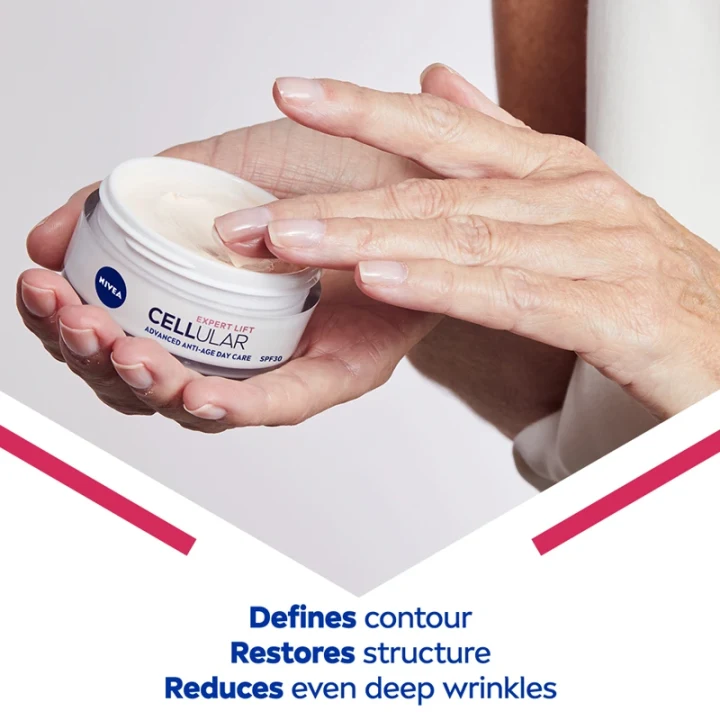 Nivea Cellular Expert Lift Day Cream är en dagkräm för ansiktet med solskydd SPF30. Berikad med bakuchiol som kan bidra till att stimulera den naturliga kollagenproduktionen i huden vilket kan hjälpa till att släta ut hudytan. Innehåller micro och macro hyaluronsyra som har egenskaper som är mjukgörande och bidrar med fukt samtidigt som det hjälper till att binda fukt i huden. Passar alla hudtyper. 50 ml.