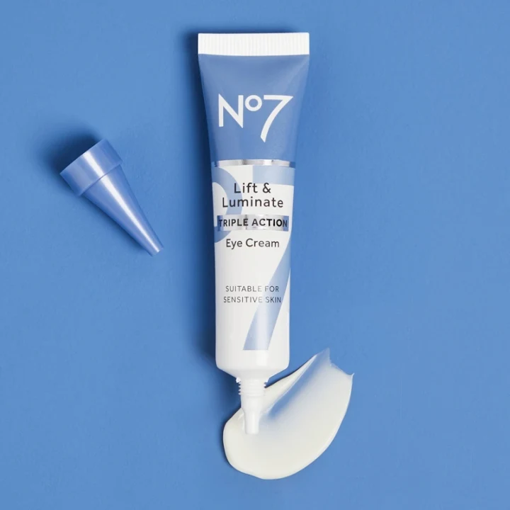 No7 Lift & Luminate Triple Action Eye Cream är en ögonkräm med utjämnande egenskaper, som kan bidra till att reducera mörka ringar, fina linjer och påsar under ögonen. Berikad med antirynk-teknologin Matrixyl 3000 Plus som innehåller peptider och kollagen som kan hjälpa till att reducera rynkor och fina linjer. Innehåller även en fuktgivande blandning av hibiscuspeptider och hyaluronsyra samt vitamin C som kan ge en uppljusande effekt. Ögonkrämen har en mild formula, speciellt anpassad för den känslig huden kring ögonen. Används med fördel både morgon och kväll på rengjord hy. Passar alla hudtyper. 15 ml.