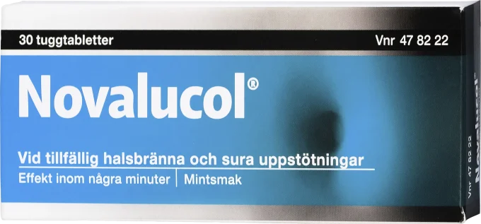 "Novalucol tuggtablett används vid tillfällig halsbränna och sura uppstötningar. Sura uppstötningar beror på att magsyra har tagit sig upp i matstrupen från magsäcken. Om mängdensaltsyra i magsäcken är för stor eller om syran ligger kvar för länge i matstrupen blir den irriterad och halsbränna uppstår. "