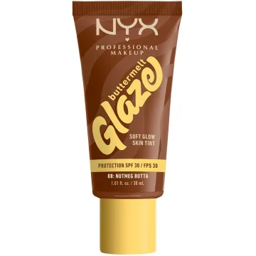 NYX Professional Makeup Buttermelt Glaze Skin Tint SPF30 är en foundation med solskyddsfaktor. Foundationen vårdar, skyddar och ger lyster. Formulan har vårdande egenskaper och är berikad med sheasmör, mangosmör och niacinamid. Den känns lätt, återfuktande och behaglig på huden samtidigt som den skyddar med SPF30 och verkar lystergivande. Efter applicering sitter foundation i upp till 12 timmar utan lägga sig i veck. Huden känns slätare och vårdad utan att kännas fet med en naturlig "no makeup"-look. Finns i flera nyanser som smälter in i huden. 30 ml.