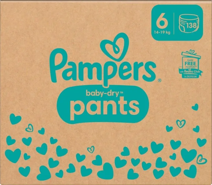 Pampers Baby-Dry är byxblöjor med en 360°-passform som ger upp till 12 timmars läckageskydd. Byxblöjan har en Stop & Protect-ficka, en superabsorberande kärna som suger upp fukt direkt och dubbla benskydd som hjälper till att förhindra läckage runt benen. Blöjan sätts på i ett enda drag tack vare den flexibla linningen runt hela midjan som även gör att den är lätt att ta av. 138 st.