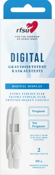 RFSU Digitalt Graviditetstest är ett lättanvänt digitalt graviditetstest som visar ett resultat inom tre minuter. Det har en bred spets som gör det lättare att kissa direkt på testet. Den digitala skärmen visar ett tydligt svar med texten “Yes” eller “No”. Du kan göra testet från och med den dag som du väntar din mens. Testets känslighet är 25 mlU/ml av hormonet hCG i urinen. Testet är över 99% tillförlitligt från och med dagen du väntar din mens. Du kan testa när som helst under dygnet men säkrast är att mäta morgonurinen, då hCG-koncentrationen är som högst.