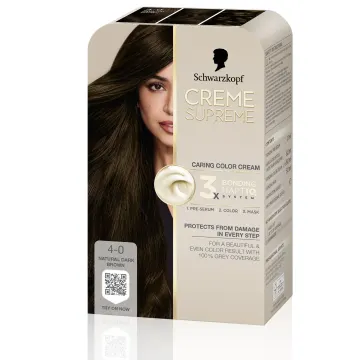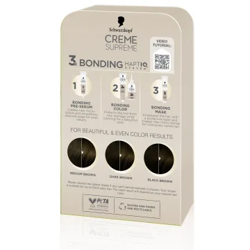 Schwarzkopf Creme Supreme 4-0 Natural Dark Brown är en hårfärg med 3x bonding HaptIQ System som förbereder, skyddar och stärker håret för ett jämnt färgresultat med 100% gråhårstäckning. Det vårdande pre-serumet förbereder håret innan färgning, skapar nya mikrobindningar och bidrar till ett jämnt färgresultat. Bonding color skyddar håret från skador under färgningen och bonding hårkur skapar ett skyddande lager och vårdar håret.