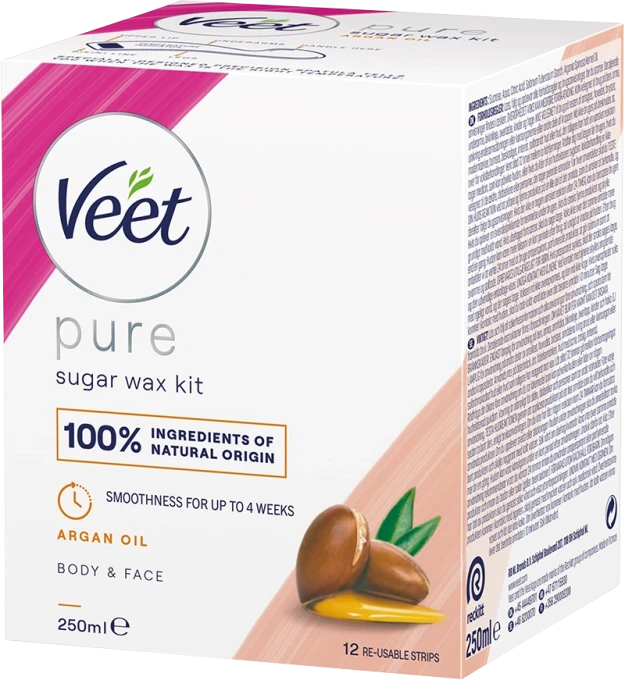 Veet Sugaring Wax with Natural Argan Oil med 100 % naturliga ingredienser är ett hårborttagningsvax som ger dig mjuk och silkeslen hud upp till 28 dagar. Vaxet tar effektivt bort hårsäckarna från roten och innehåller naturlig arganolja som är känt för sina fuktgivande egenskaper. Lämplig för användning på ben, armar, armhålor, bikinilinje, överläpp, kinder och haka. Passar normal och känslig hud. Lätt att tvätta bort med vatten. 250 ml.