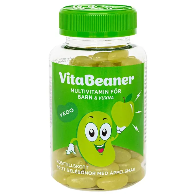 VitaBeaner Multivitamin Äpple Gelébönor är en vegetariskt multivitamin med smak av äpple för barn. Tuggisar med 12 olika vitaminer och mineraler, innehåller bland annat vitamin A, D, E och B12 samt biotin och zink. Smaksatt med naturliga aromämnen och färgämnen i en vegetarisk sammansättning fri från gelatin. God smak för både vuxna och barn. 90st