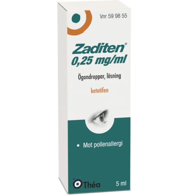 Zaditen ögondroppar är den enda receptfria ögondroppen som har dubbelverkande effekt vid allergiska ögonbesvär. Zaditen innehåller den aktiva substansen ketotifen som verkar snabbt genom att den blockerar histaminreceptorer och som verkar långsiktigt och förebyggande då den är mastcellsstabiliserande. Rekommenderad dos för vuxna och barn från 3 års ålder är en droppe i varje öga två gånger dagligen (morgon och kväll). Om du är gravid eller tror att du kan vara gravid, tala med läkare innan du börjar använda Zaditen.
